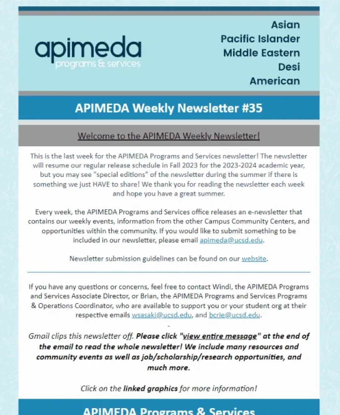 In addition to Instagram, I also maintained APIMEDA Programs & Services’ weekly newsletter, which provides information about events and opportunities across campus.